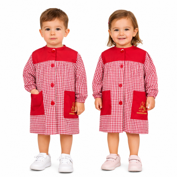 El baby está confeccionado en cuadros rojos y blancos, con canesú y bolsillos en rojo liso. Botones en la parte delantera, goma en puños y bordado en el bolsillo.