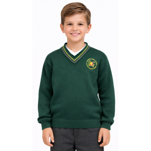 El Jersey es imprescindible en cualquier uniforme escolar. Está confeccionado en punto verde, con cuello a pico y con un toque personalizado en el cuello del mismo tono de color que el resto del uniforme escolar.