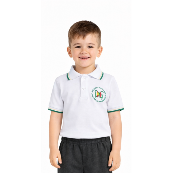 El polo de manga corta está confeccionado con punto de piqué en blanco. El elástico de las mangas y el cuello son en blanco con el mismo detalle en verde y amarillo que la camiseta de pico.