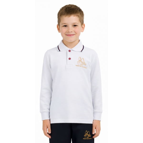 El polo de manga larga está confeccionado con el mismo tejido que el polo de manga corta y la camiseta de deporte. En punto de piqué blanco con cuello de rayas marino y granate.