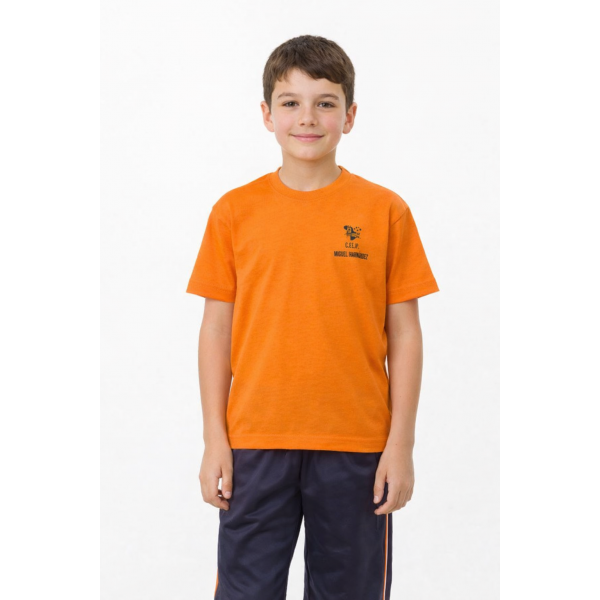 Camiseta de algodón de manga corta, elegida para el uniforme escolar deportivo, en color naranja, estampada en la espalda con el nombre del colegio y en la parte delantera el logotipo del colegio.
