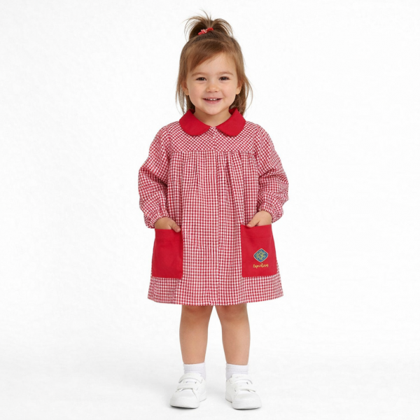Baby escolar de cuadros rojo con bordado en el bolsillo.