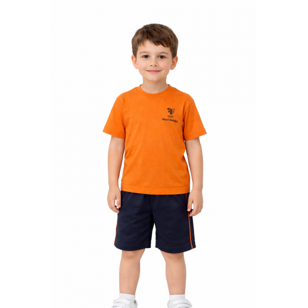 Pantalón corto para deporte fabricado en España en punto de piqué azul marino con vivo naranja. Con bolsillos.